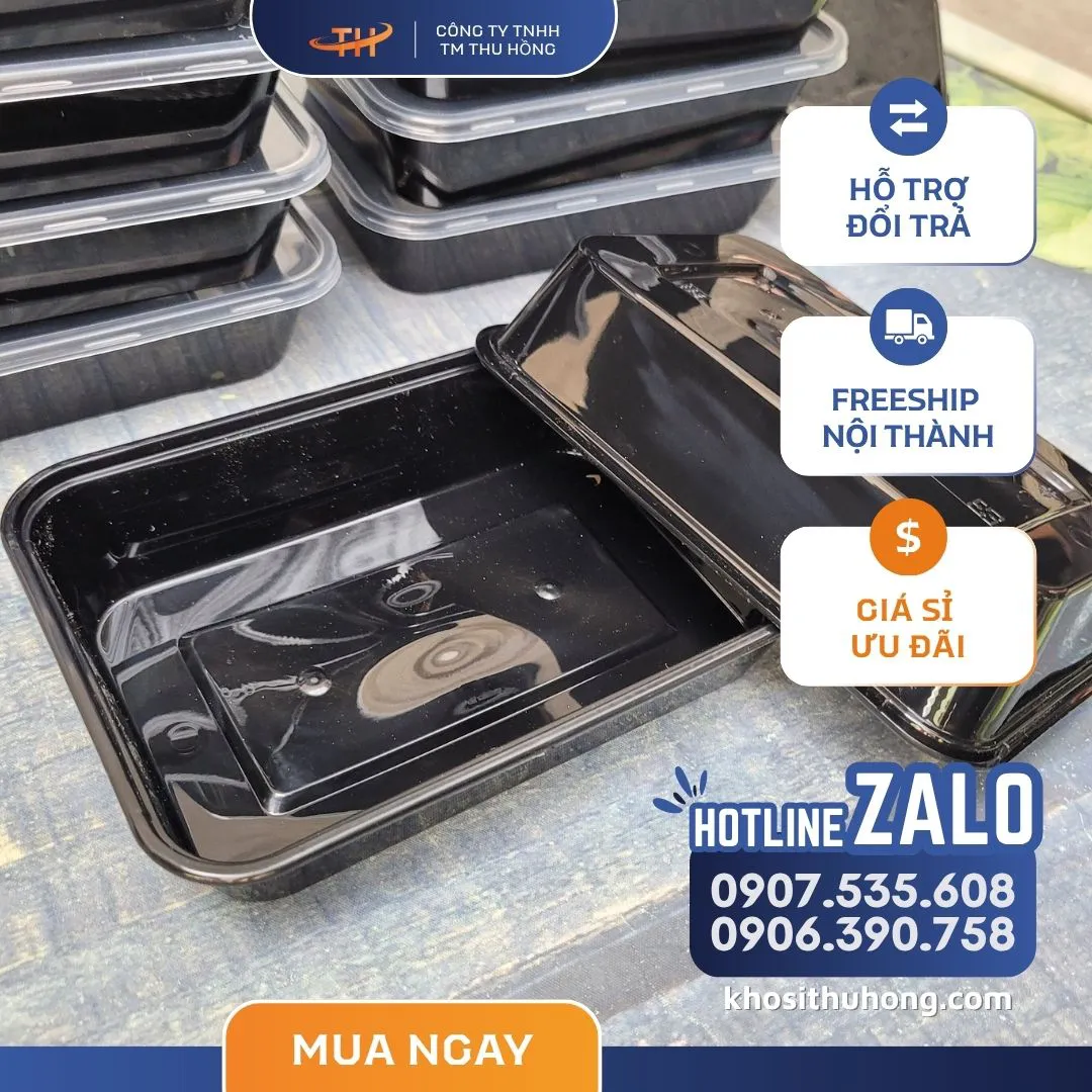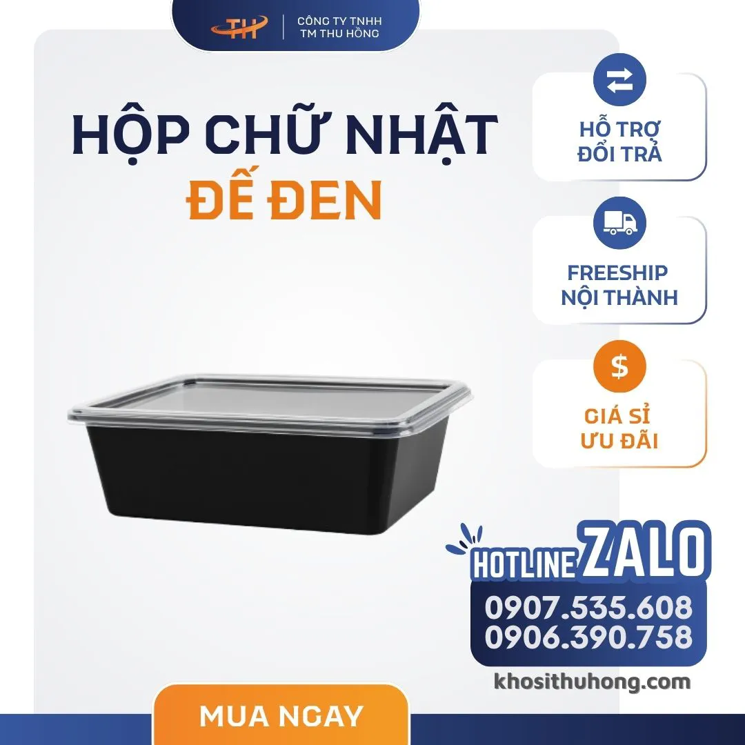 Thu Hồng chuyên cung cấp sỉ hộp nhựa thực phẩm các loại với số lượng lớn, giao hàng toàn quốc. Hộp chữ nhật đế đen được nhập xưởng trực tiếp, có đủ size 500ml – 1000ml, hàng luôn có sẵn số lượng lớn.