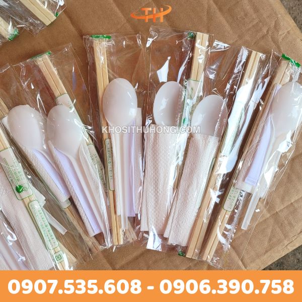 Combo muỗng đũa dùng 1 lần bao gồm 4 món: đũa tre, muỗng, tăm và giấy ăn được đựng trong túi bọc OPP trong suốt.